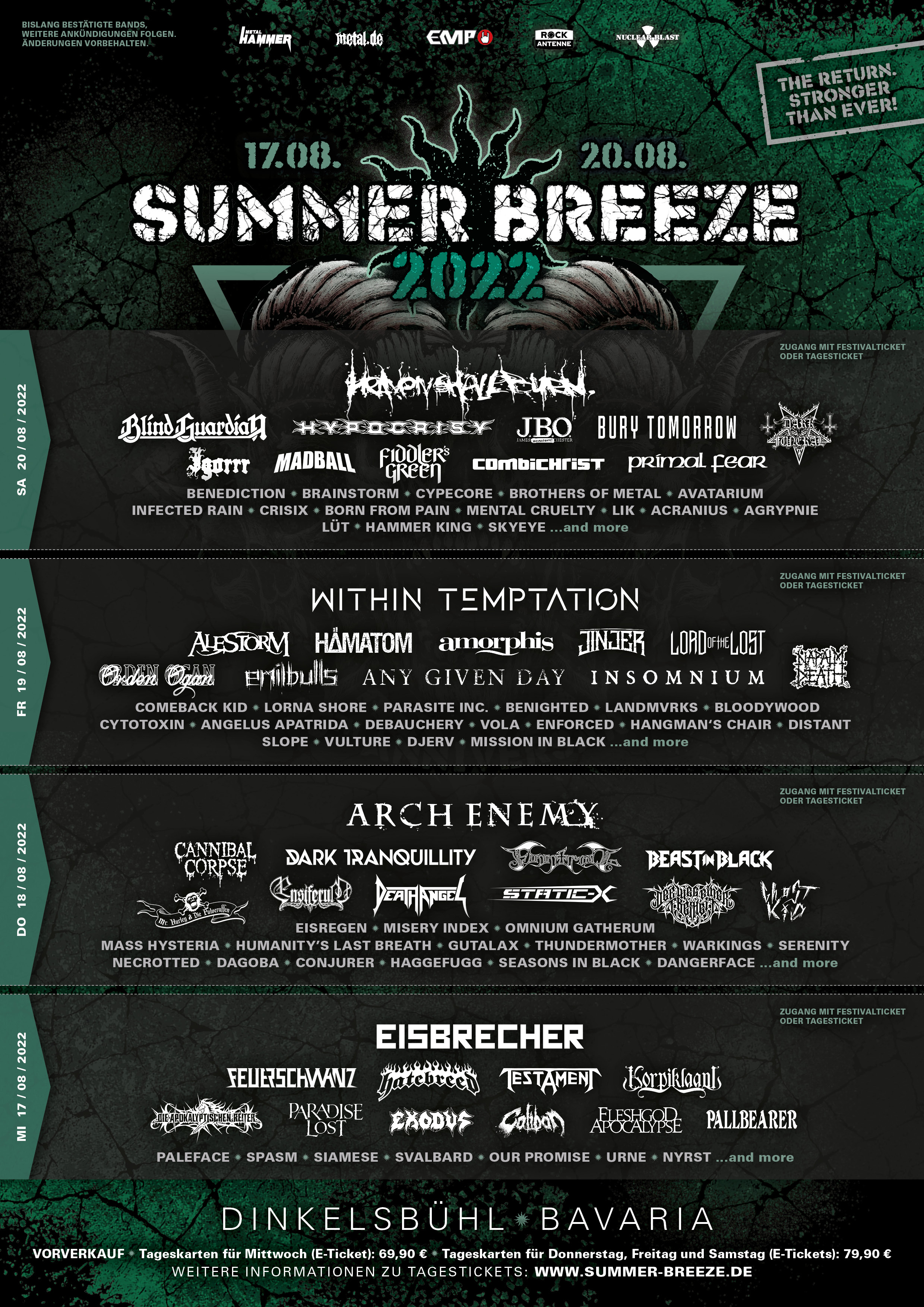 There are two important changes in the daily running orders for SUMMER BREEZE Open Air 2022: BLIND GUARDIAN will now play on Saturday, August 20, while WITHIN TEMPTATION will rock the stage on Friday, August 19.