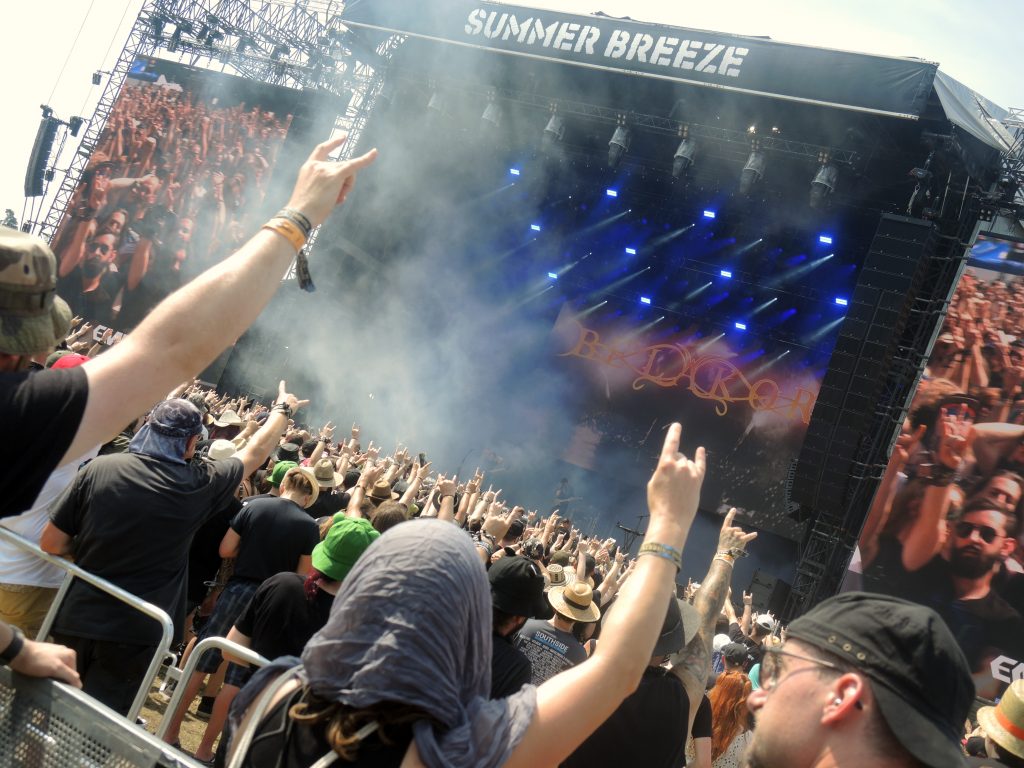 The great finale of the open air festival season was about to happen in Dinkelsbühl, same procedure as every year before as after the pandemic break. The festival set up pretty much stayed the same due to the stages, the label matinees, etc.. So no wonder the organization ran ideal. Most obvious innovation were the two side banners flanking the T-Stage and showing the portrait of the passed SB-organizer Michael Trengert the T-Stage is named for. After the rainy 2022-edition the Summer Breeze got its eponymous sunny weather back. Sometimes a bit too hot, but anyway better than the constant rain one year before. Thunderheads got sighted, but passed Dinkelsbühl.